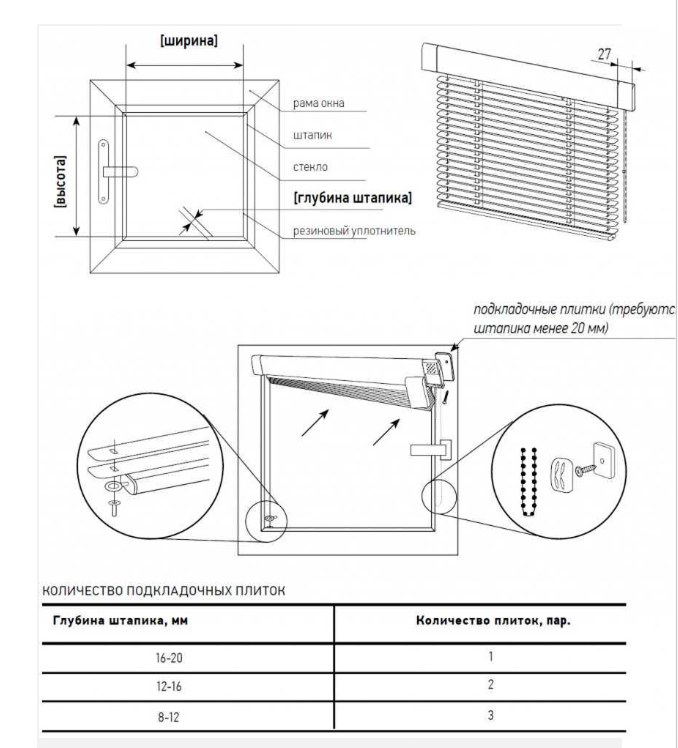 Замер кассетных горизонтальных жалюзи осуществляется по высоте и ширине посередине резинового уплотнителя. При этом необходимо замерять глубину штапика - расстояние от поверхности окна до стекла (перпендикуляр). Кассетные горизонтальные жалюзи не рекомендуется устанавливать на окна с глубиной штапика менее 8 мм.