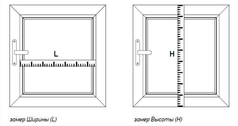 Замер данной системы осуществляется следующим образом ширина по стыку штапика с рамой окна (см рис.слева) высота по открывающейся створке, от низа створки до верха (см. рис. Справа)